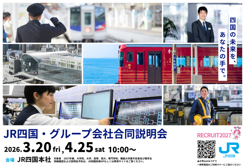 2026年3月20日(金・祝)、4月25日(土)にJR四国本社において開催される「JR四国・グループ会社合同説明会」に弊社も参加いたします。当日は弊社の採用担当が業務の内容を詳しくご説明させていただきます。誰もが安心して自由に移動できる鉄道システムを縁の下で支え、多くの鉄道事業者様から「頼りにされる技術者集団」を目指す弊社にご興味を持たれている学生や転職希望の方は、是非ご参加ください。